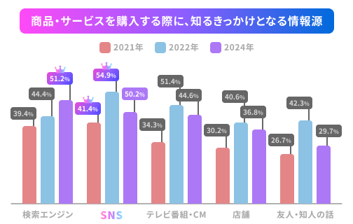 商品・サービスを購入するきっかけになった広告媒体について聞いたところ、「SNS」が最も多い。