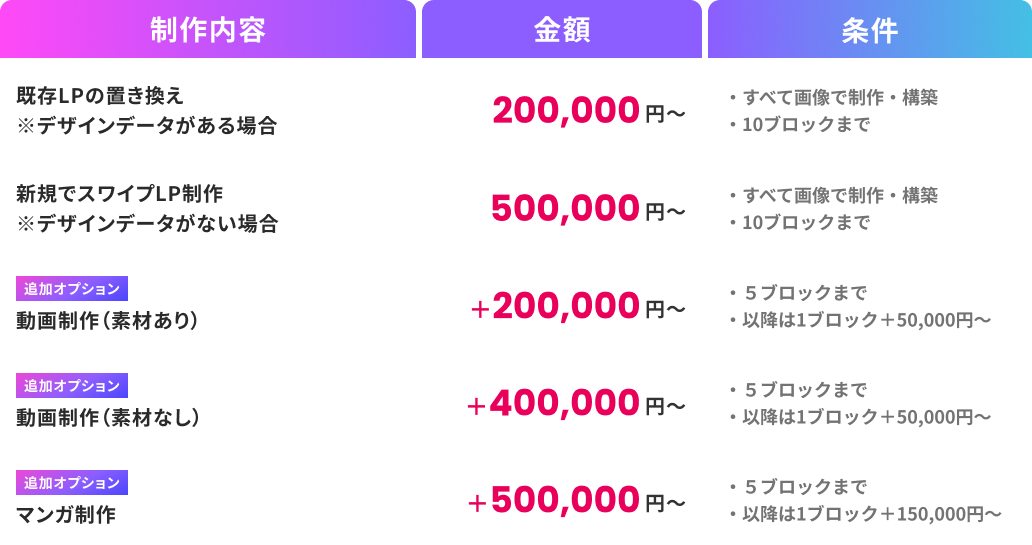 スワイプ型LPに変更したいサイトのデザインデータを提供するだけでOK。当社のデザイナーがスワイプ型に整え構築いたします。素材がなくても新規LPの制作や動画の制作も可能です。